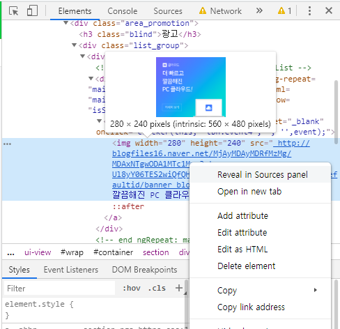 그리고 이미지 주소를 오른클릭하여 "Reveal in Sources panel"을 눌러보자.
